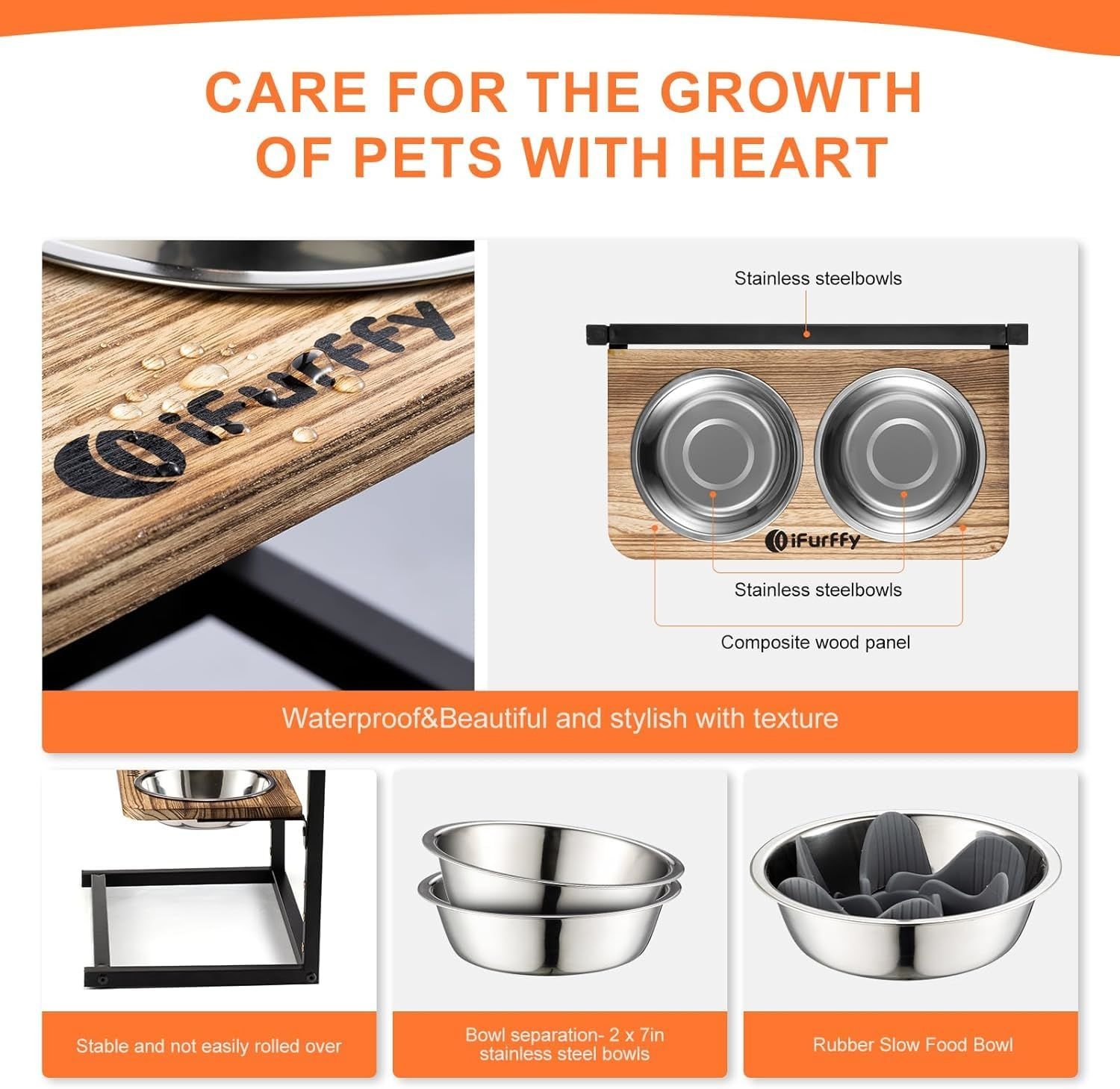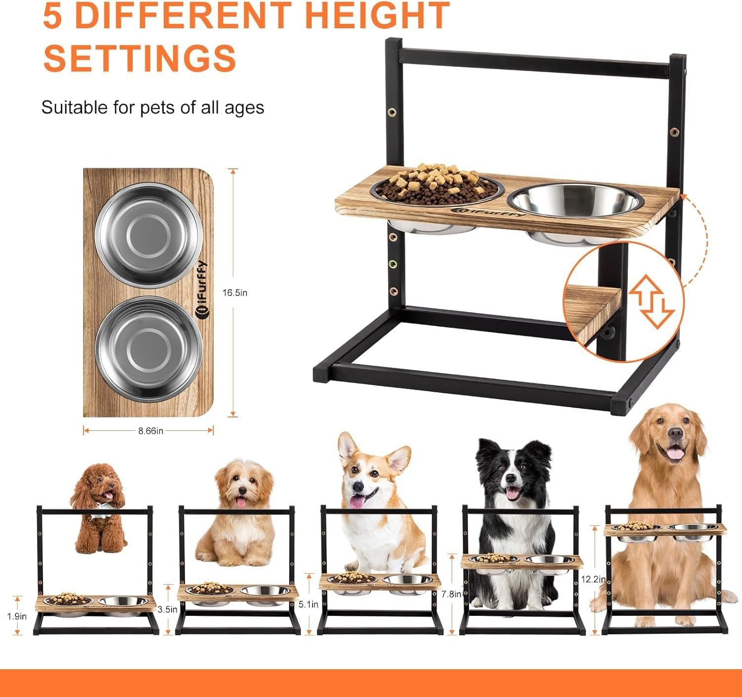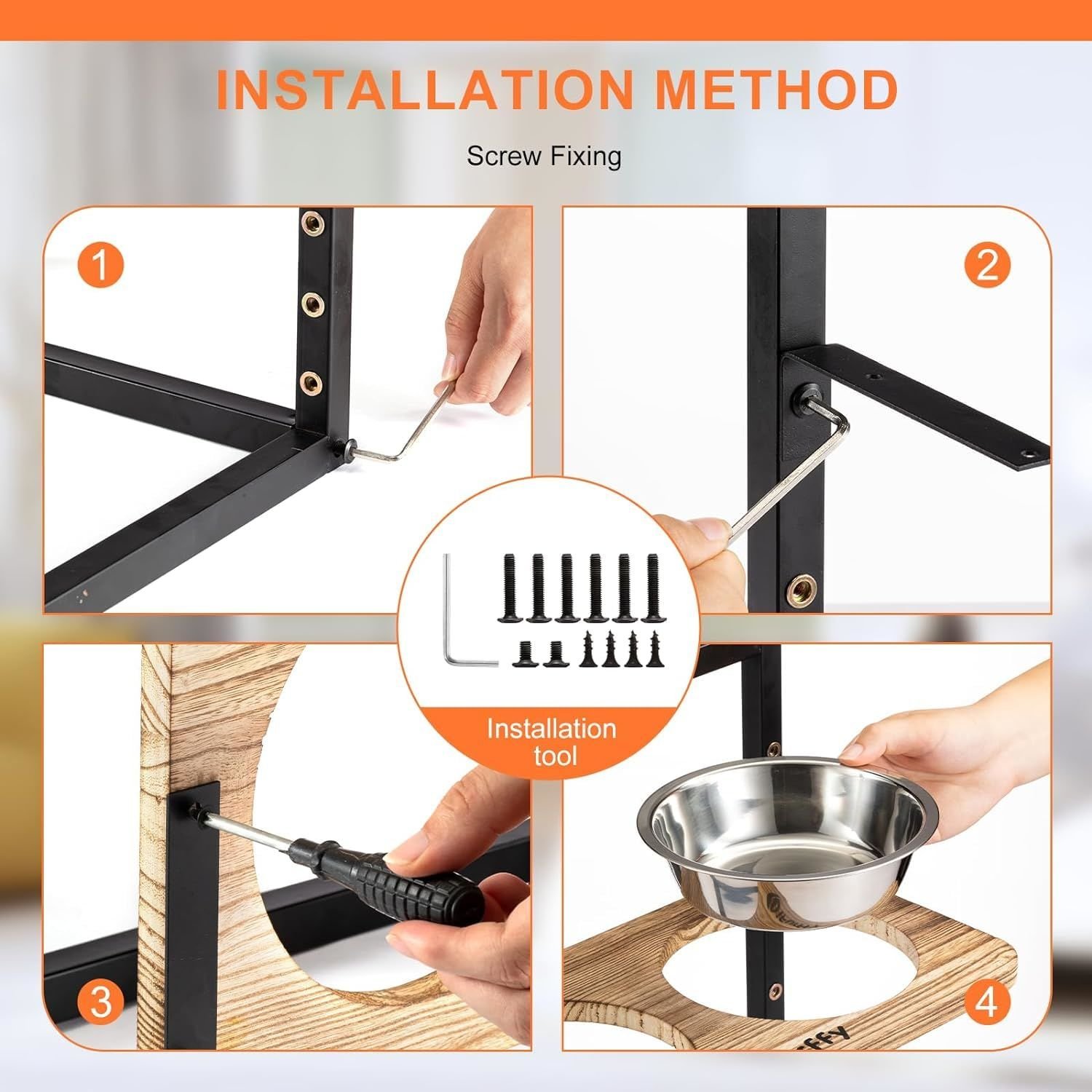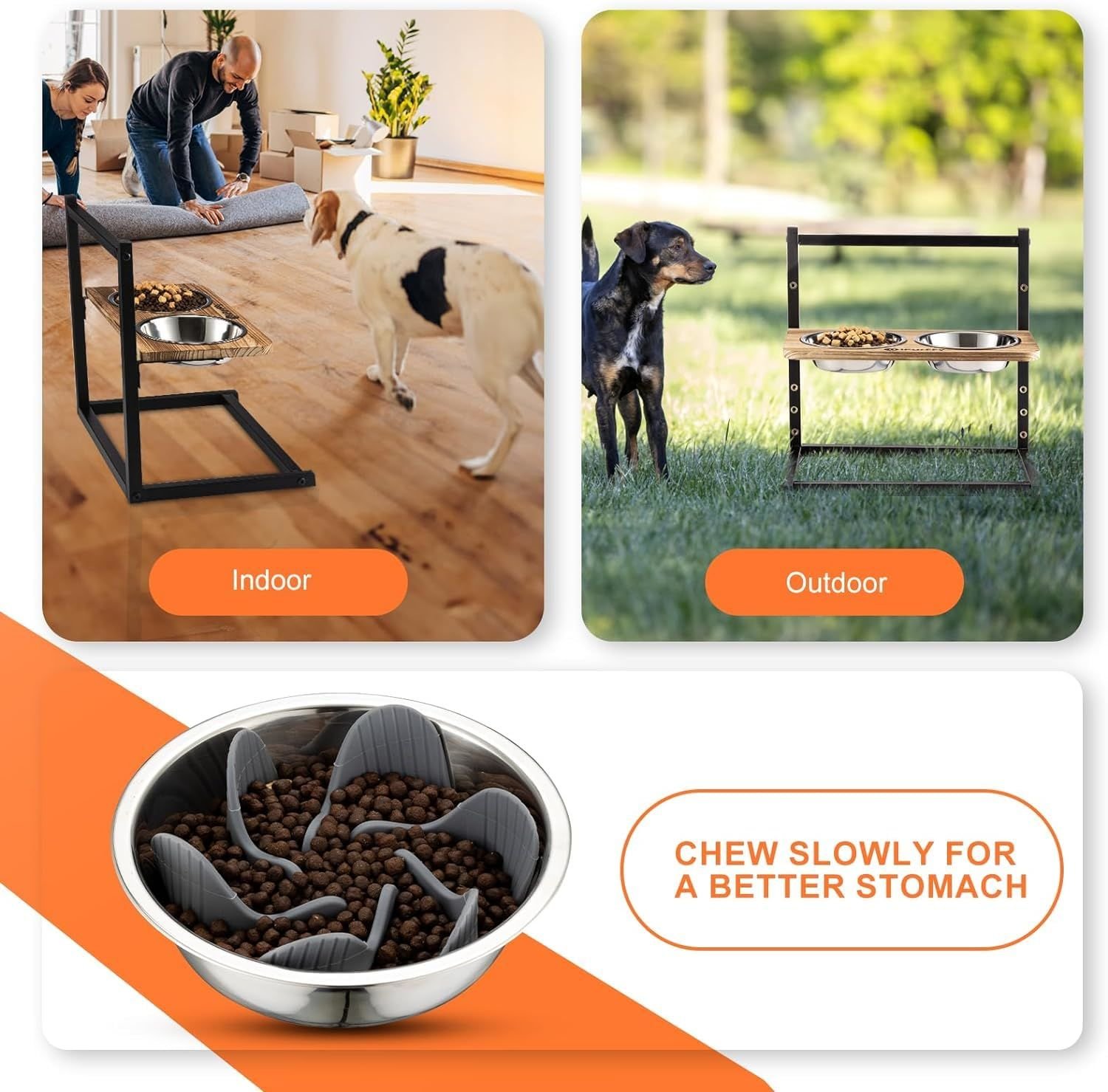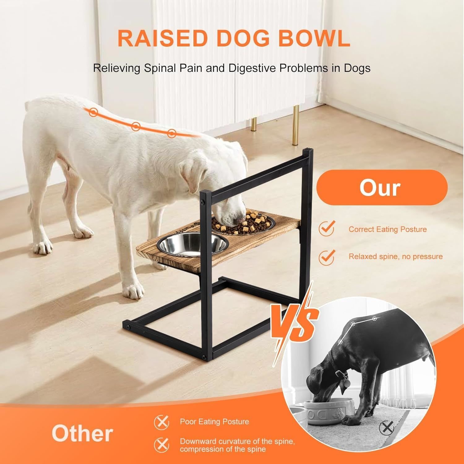 Taking care of your pet's spinal health starts with the details Adjustable-5 adjustable heights to meet the height needs of animals of all sizes. Can be used from the pet's young age to old age. Stainless Steel Bowls-2 Removable and washable stainless steel bowls to hold any kind of food, additional slow food bowls to train your pet to chew slowly. Separate-Easy to dismantle, easy to clean, rust-resistant graphic layer to maintain aesthetics, dog bowls can be changed as needed to create a unique elevated dog bowl. Stable-Strong and stable, won't roll over. It's time to replace your plush friend's bowl. Non-adjustable,uncomfortable eating height-Prolonged use can compress the spine and cause discomfort. Non-removable,difficult to clean-Standing water can enter the interior the dog bowl through the seams, creating odours and stains over time. Requires applicable tool and complex installation-Cumbersome installation affects the experience. No anti-rust coating,unattractive-Easy to rust, affecting the aesthetics. 5 ADJUSTABLE HEIGHT DETAILS SHOW EASY INSTALLATION Installation completed in 4 sections Assemble the base with the Lbracket Fix the bracket Install the bowl holder Put on the bowl