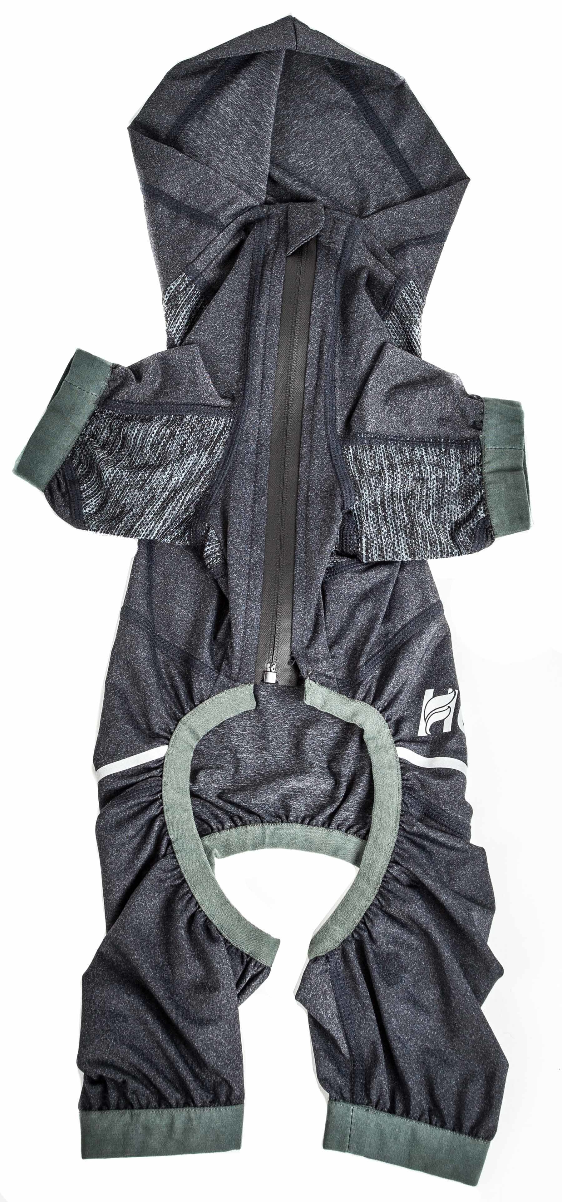 4.Seamless construction with conformed fitted elasticity around the body and sleeves for a more customizable fit, with added perforated Stretchy Mesh-Panels along the arms for Strategic Ventilation and Flexibility with Waterproof Zippered Construction and a Leash Slit along the back.