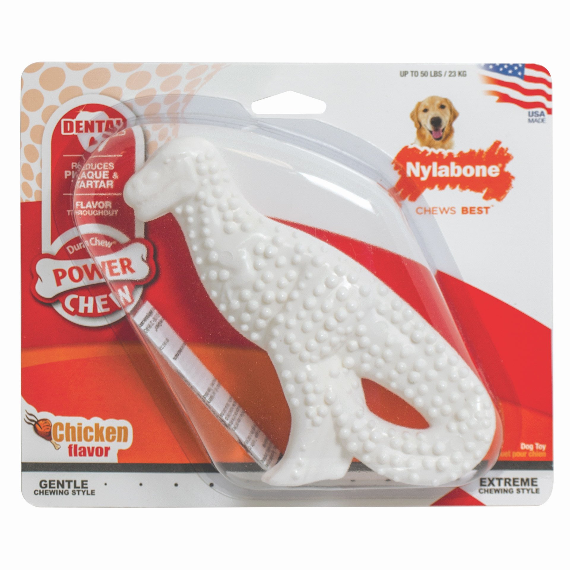 The Power Chew DuraChew Dental Dinosaur satisfies your dog’s prehistoric urge to chew with irresistible chicken flavor. Plus, the gently rounded nubs and the bristles raised during chewing promote clean teeth and help control plaque and tartar buildup. Made in the USA! For dogs up to 50 lbs Helps with destructive chewing, boredom, dental care, stress and anxiety Ridges and nubs help clean teeth Chicken flavor