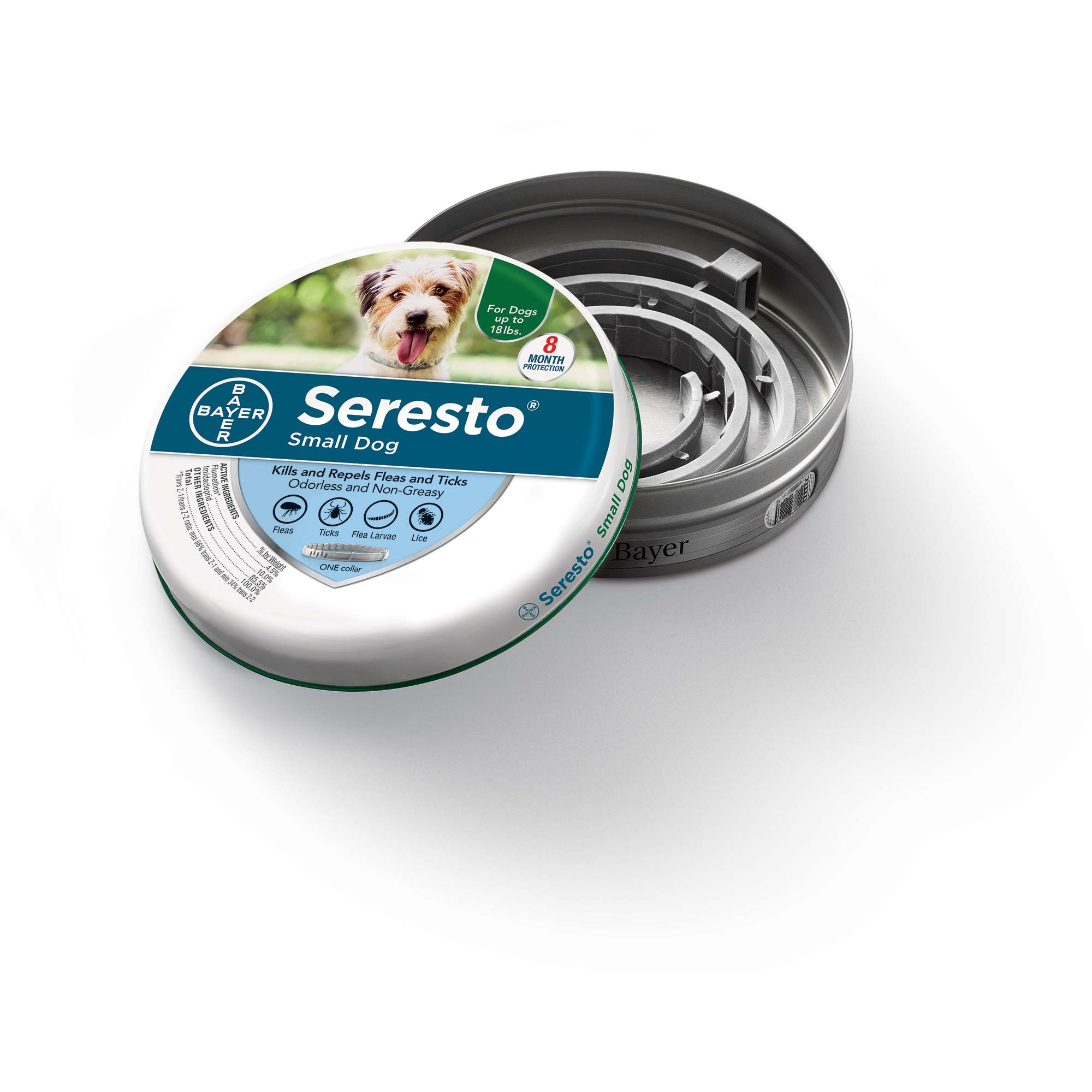 With its innovative delivery system, Seresto offers a breakthrough in flea and tick protection for dogs for 8 months. Seresto repels and kills fleas and ticks. The Seresto collar offers the performance of a topical with the convenience of an easy-to-use collar. If a tick is repelled, it can't attach and transmit organisms that cause disease. Seresto is non-greasy, odorless, and easy-to-use for small dogs 7 weeks of age and older and under 18 lbs. The flea collar is water resistant and remains effective following monthly bathing, occasional swimming (if swimming occurs more often than once a month, the duration is reduced to five months) or after exposure to rain or sunshine. This collar also features a release mechanism which in the unlikely event of a pet becoming trapped, the pet's own strength is sufficient to allow for a quick release. Dogs will be dogs. Whether they get into the garbage can out back or dig up that old shoe in the yard, Seresto for dogs can help keep them protected from fleas and ticks for 8 continuous months. The innovative Sustained Release Technology of Seresto provides effective flea and tick protection in an easy-to-apply, non-greasy collar. Seresto is a unique polymer matrix collar that offers a continuous supply of two active ingredients: imidacloprid and flumethrin for effective 8-month protection against fleas and ticks. That's one convenient, non-greasy, odorless flea and tick collar instead of 8 monthly treatments. The active ingredients are stored within the collar. They are released in low concentrations and are distributed over your dog's hair and skin surface for 8 months. As active ingredients wear off over time, Seresto for dogs continuously replenishes the skin and coat with a new supply of active ingredients. Fleas and ticks are killed through contact with the active ingredients — no biting required. Sustained release technology provides 8 month flea and tick protection Veterinarian recommended collar repels and kills fleas and ticks Provides non-greasy, odorless flea and tick prevention insecticide Preventive medication that repels ticks and stops transmission of disease-causing organisms Top rated flea and tick collar eliminates pesky pests