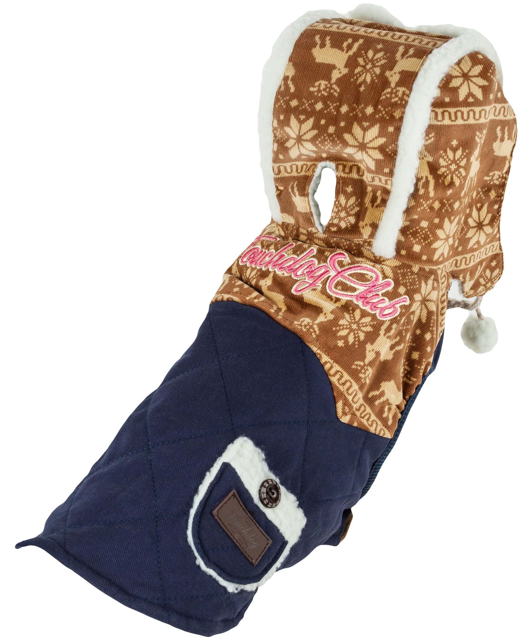 The Touchdog Snowadayz Pom-Pom Hooded Sweater Features a trendy Box-Stitched Polyester and Polar Fleece Reindeer Patterned Outershell with Outer Sherpa Lining and accented Adjustable Hooded Pom-Poms. Features an accented Outer-Lined buttoned Back Pockets and Trims with stitching. Additionally, this cool Dog Hoodie features a Leash Slit by the bottom portion of the hood and backside with the Touchdog embroidered tradestamp of perfection on the back-side. Available in Multiple Colors and Sizes. Sizing Guide: From Back of Neck to Tail area ("In" Inches)